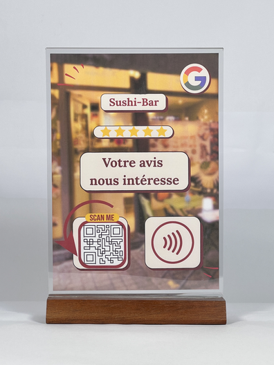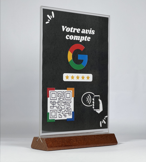 Parfait pour refléter l’identité de votre commerce tout en incitant vos clients à laisser un avis. Un outil premium qui valorise votre image et attire plus de clients.